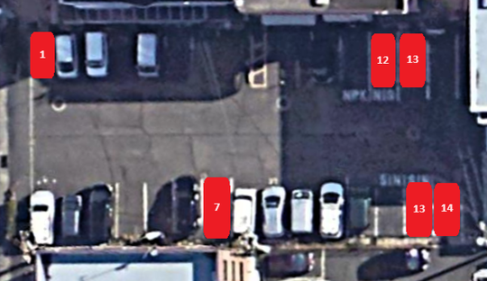 赤枠が専用駐車場です(枠内の数字は道路側よりの台数です。)