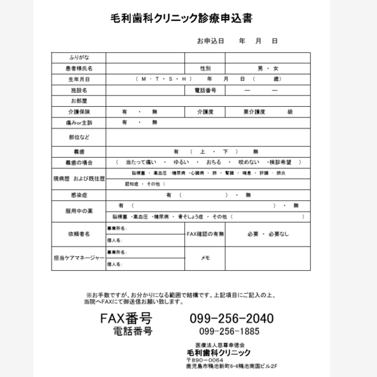 鹿児島市・鹿児島で訪問歯科や往診による診療をお探しなら、「毛利歯科クリニック」にお問合せください。施設やご自宅での丁寧な治療を提供いたします。